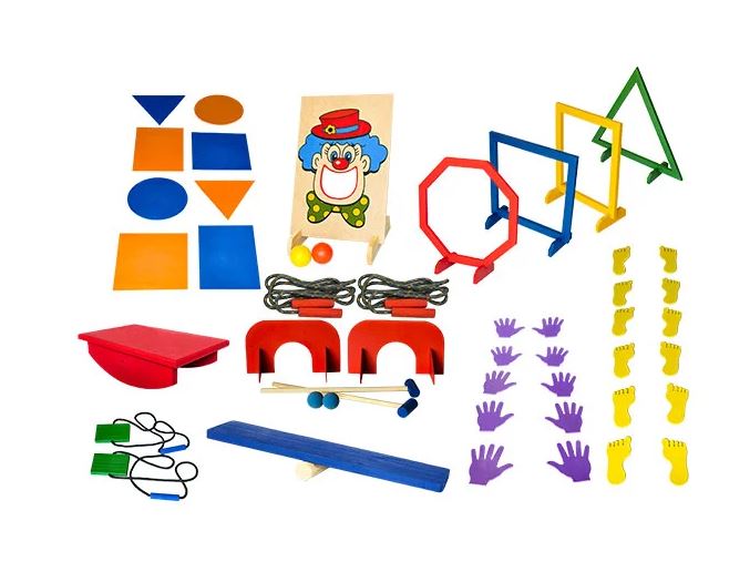 Este conjunto de materiais permite a realização de uma série de atividades que visam o desenvolvimento da coordenação dinâmica global da criança. O material também pode ser usado para trabalho em grupo e/ou atividades individuais.