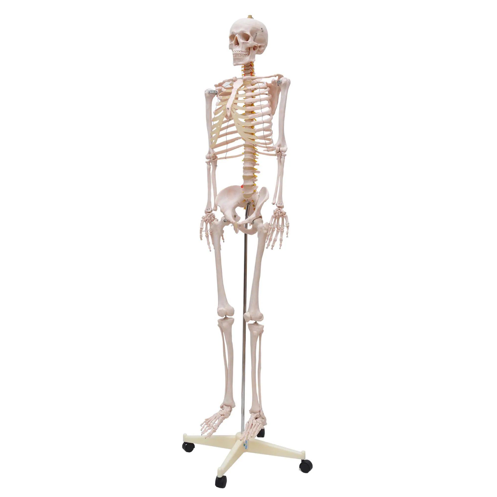 Apresenta ossos do corpo humano. Crânio com abertura mandibular, dentes e calota craniana